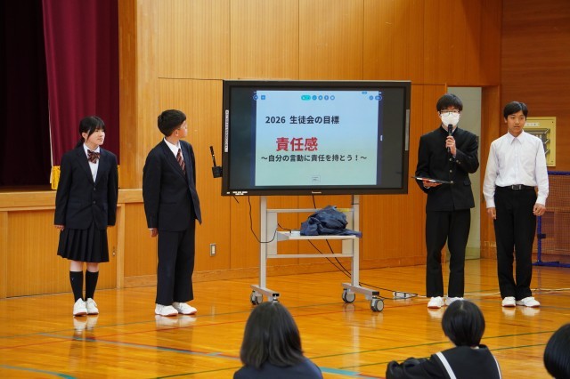 任命式の後には、生徒会執行部から生徒会スローガンが発表されました。今年度のスローガンは「責任感 ~自分の言動に責任を持とう!~」です。