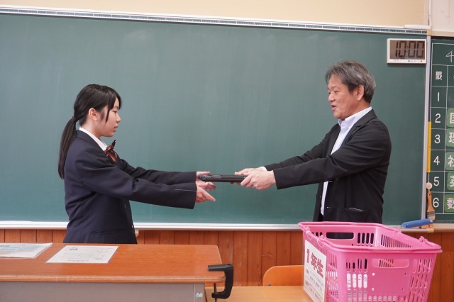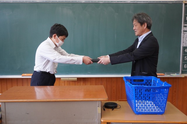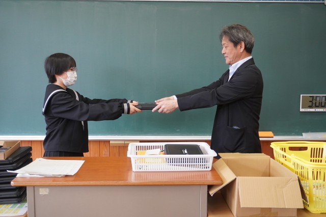 松阪市が進める「GIGAスクール構想」に基づき、今年度も生徒一人ひとりに学習用端末(iPad)が貸与されました。本日、校長先生から各学年の代表生徒へiPadが手渡され、いよいよ本格的な活用がスタートします。