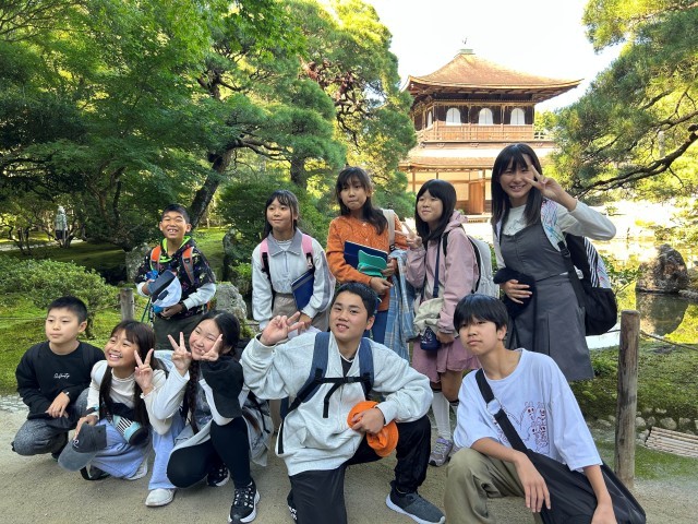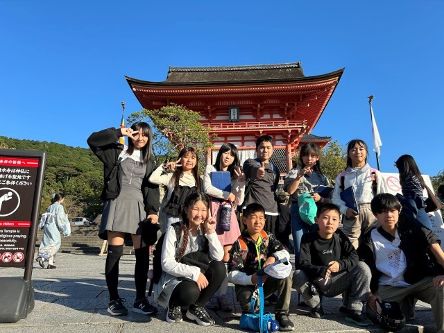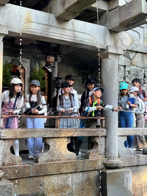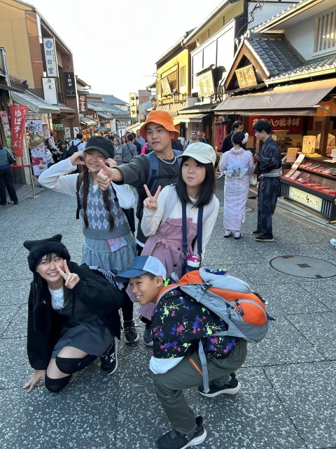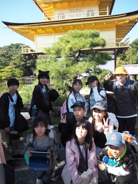 お天気にも恵まれ、6年生10人が元気に修学旅行に行ってきました。1日目は京都で、世界遺産や歴史的建造物をめぐり、社会で学習した教科書の内容を実際に訪れ、学びを深めました。一つの見学地を終えると、バスの中で一人一人が感じたことや学んだことを発表し、とても有意義な時間となりました。金閣寺や清水寺は、さすがにすごい人でしたが、清水寺では、恒例の音羽の水も全員飲むことができました。みんなの願いがかなうといいですね。