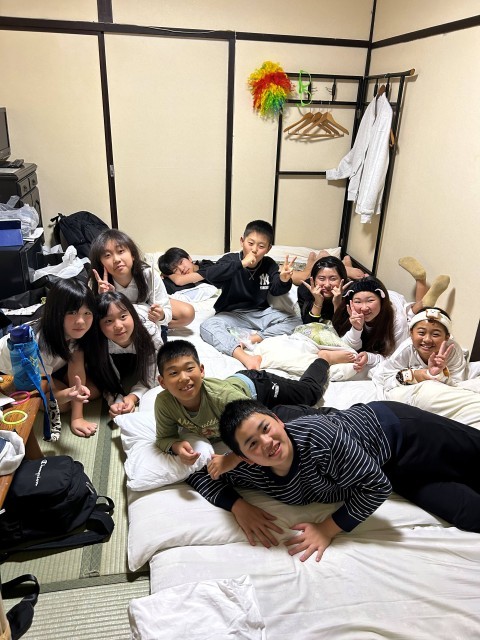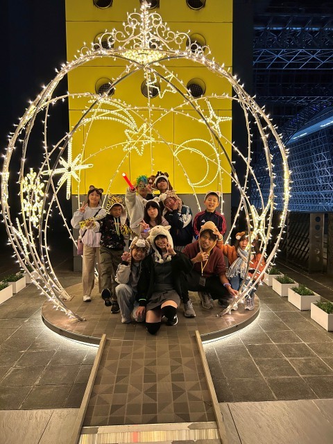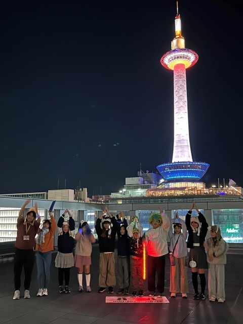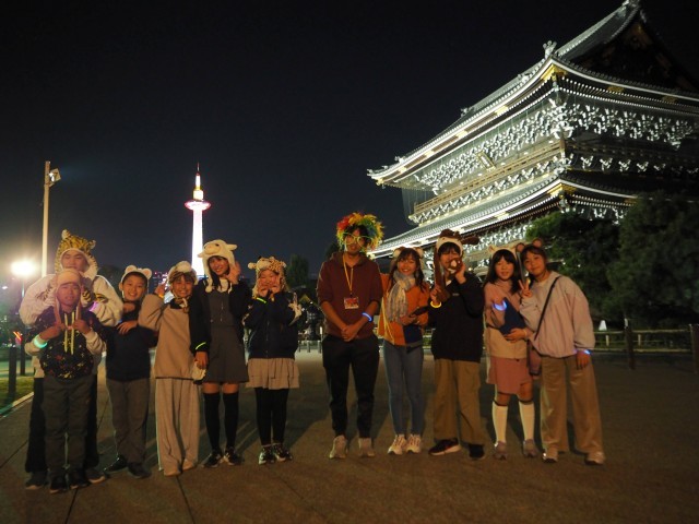 夜は、お楽しみの京都駅へのお出かけです。今年も添乗員さんのアイディアの被り物で盛り上がり、みんなハイテンションで夜の京都を楽しみました。外国からの観光客の方がほほ笑ましそうに見てくれていました。美しい京都タワーをバックに何枚も写真撮影をしました。京都駅でのプロジェクションマッピングもとてもきれいでした。