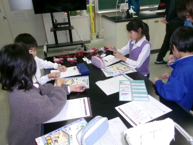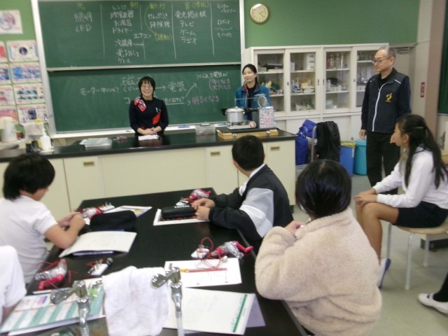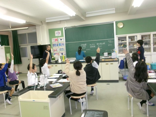 南プロジェクトでバイオマス発電のけむりについて探究していた4年生が、「発電って?」ということで中部電力の方に来ていただいて出前授業をしていただきました。身の周りの電気で動くものを出し合ったり、コイルをまわして電球をつけたりして、磁石と動力によって電気を生み出す仕組みについて学びました。水力、風力、火力、太陽光など動力のおこし方によっていろいろな発電の仕方があることも知ることができました。また、電力のもとになる原料は多くを輸入に頼っていて、電力の自給率はとても低いことに子どもたちは驚いていました。また、新たな問いにつながるかもしれません。