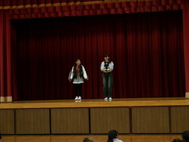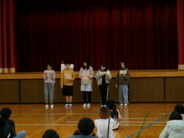 今回の全校集会は、図書環境委員さんの発表とチャレンジ集会でした。図書環境委員会では、読書の秋にちなんで、ビンゴやガチャガチャに取り組んでいます。見事ビンゴした人に賞状が贈られました。今回は、ブックガチャで、ガチャガチャででた本をかりるというお楽しみ企画です。またチャレンジ集会では、5,6年生が「ラバーズコンチェルト」の合奏を聞かせてくれました。その後、シャトルランとダンスクラブの発表もありました。