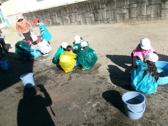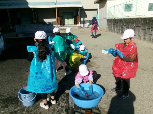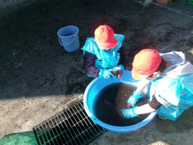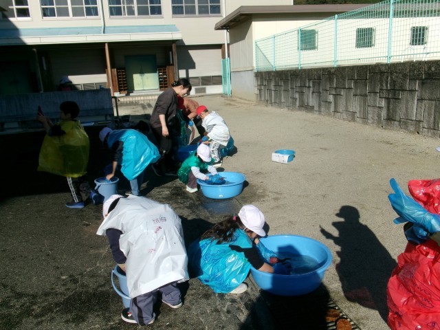 1,2年生が次の日の焼きいも会の準備で、収穫したさつまいもをきれいに洗ってくれました。手作りのカラフルないも洗い用エプロンをかぶって、みんなで、さつまいもの土を落としてくれました。水が少し冷たかったと思いますが、寒さにも負けず、次々と洗っていき、100個以上のさつまいもがとてもきれいになりました。焼きいも会で食べるのが楽しみですね。