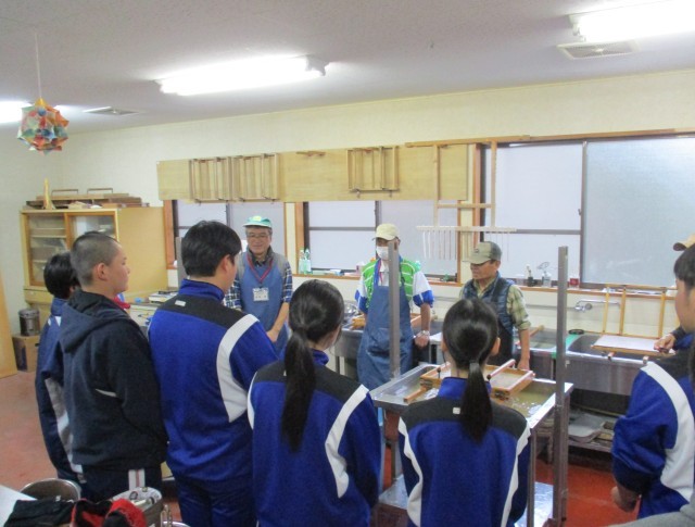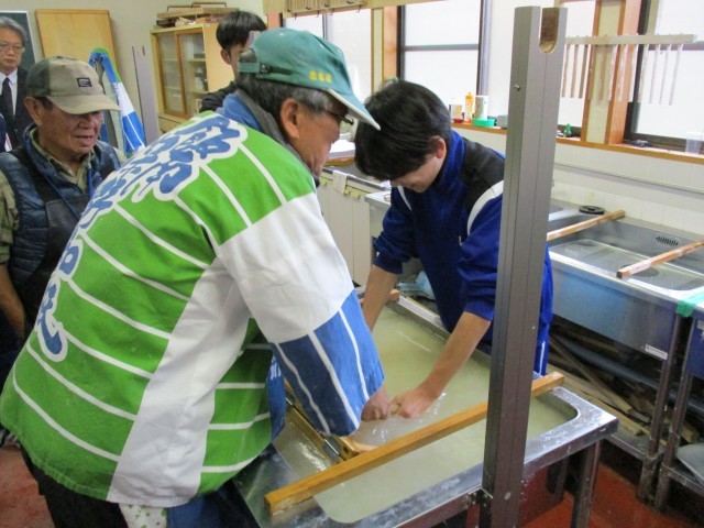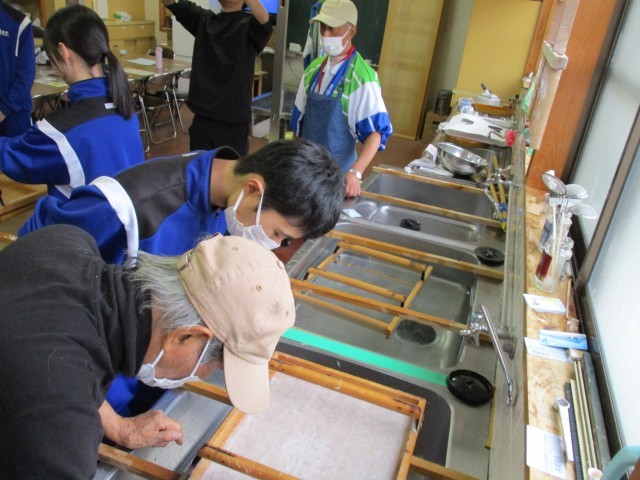 紙をすく作業は想像以上に難しく、生徒たちは苦戦しながらも一生懸命取り組みました。