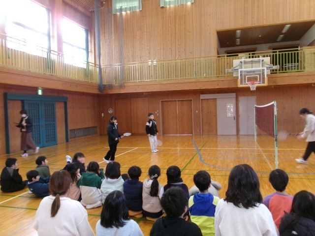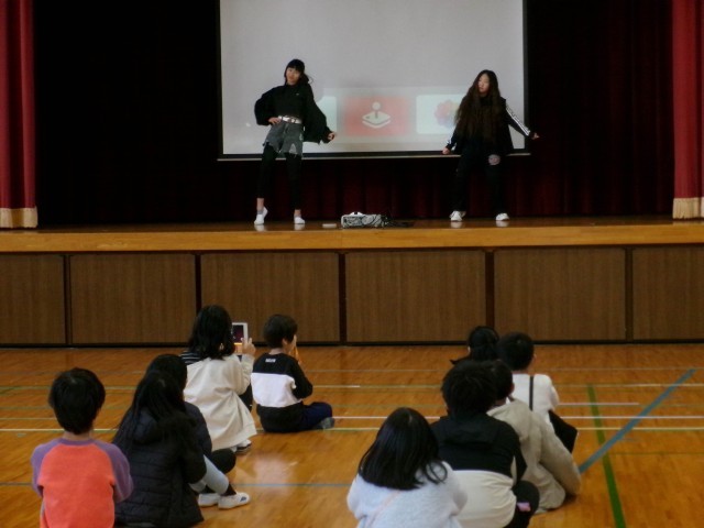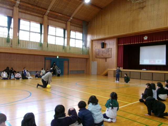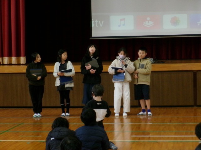 1月の全校集会では、図書環境委員会の発表とバドミントン、ボールキャッチ、ダンスクラブのチャレンジが行われました。