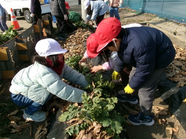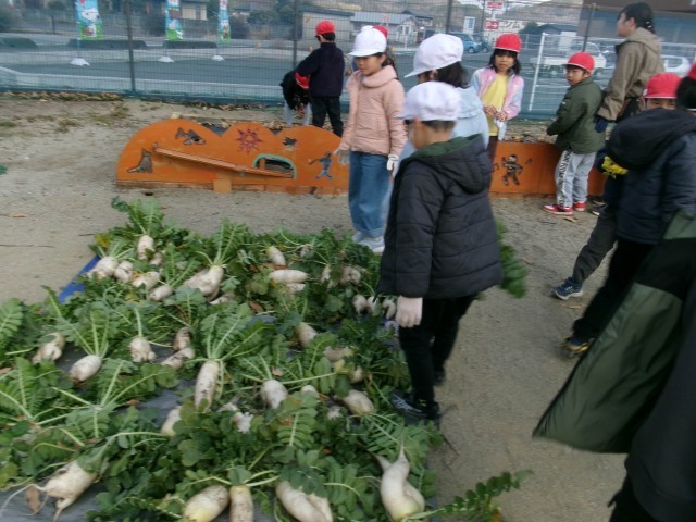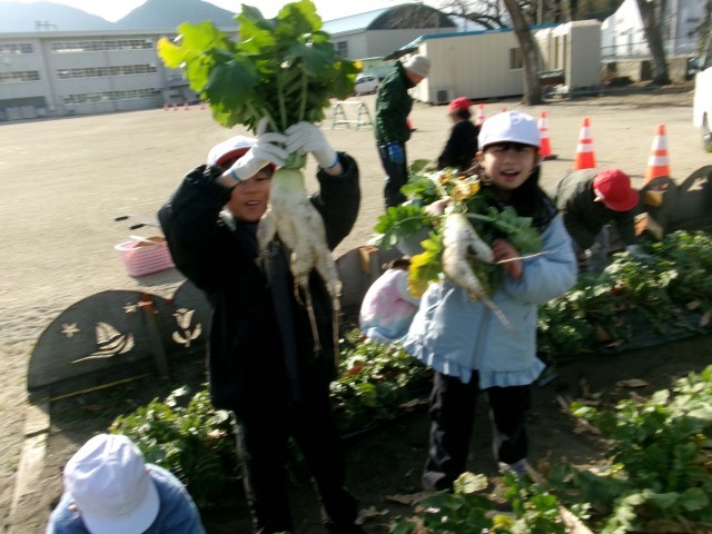 地域の方にお世話になり、秋に種をまいた大根の収穫を1,2年生が行いました。抜くたびに、いろいろな形の大根が採れ、大喜びの子どもたちでした。収穫した大根は、一人ひとりが家に持って帰ったり、給食に使ってもらったりしました。たくさん収穫できたので、全校のみんなにもおすそ分けしました。