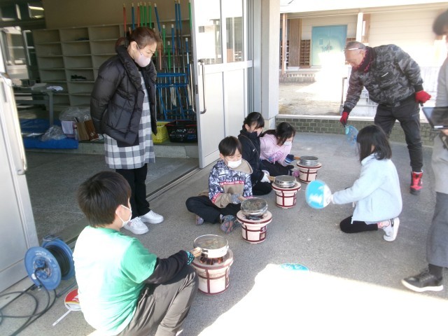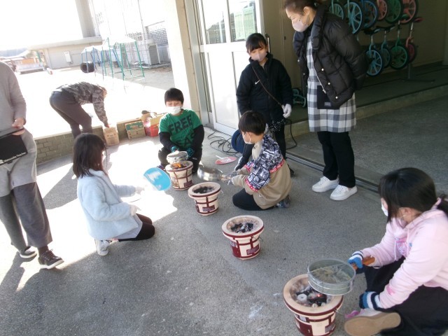 今年も校務員さんと地域の方にお世話になり、3年生があられ煎り体験をしました。簡単そうに見えて、あられが柔らかくなるまで焦がさずに煎るのはなかなか大変です。みんなで交代しながら、火をあおいだり、金網をゆすったりしながら、がんばりました。最後は、全校のみんなにおすそ分けです。校舎中にあられの子おばしいにおいが広がりました。