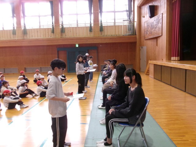 5年生が中心となって企画運営してくれた6年生を送る会が行われました。みんなでの遊びは外でのドッジボールやおにごっこでした。ルール説明や時間配分を5年生がしてくれて、少しずつ学校のリーダーのバトンが渡されているのだなあと感じました。がんばっている5年生がたのもしかったです。手つなぎおにでは、6年生と小さな1年生が手をつないで走っている姿もあり、思わず笑みがこぼれました。最後に1年生から5年生までたきなが班ごとに書いたメッセージを渡しました。お返しにと6年生からもそれぞれの学年へのメッセージがありました。全校みんなで仲の良い、南小学校ならでは、ですね。