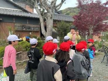 チューリップなどの春の花が満開になっているのを見せてもらうために、1年生と2年生が地域の方のお庭に行きました。