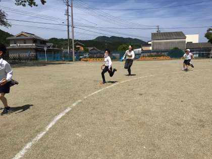 今年度初めてのたきなが班(縦割り班)遊びが行われました。今回は1年生から6年生まで丸い輪っかのバトンをつないでいくリレーです。6人の1年生がスタートし、抜きつ抜かれつしながら6年生がゴール!勝っても負けても一生懸命走り、一生懸命応援する姿がすてきでした。その姿に触発されて、2回戦は、先生チームも参加!真剣にトップを走る先生たちに子どもたちから「大人気ない・・・」の声も…大人も子どもも南小のみんなが楽しんだひとときとなりました。