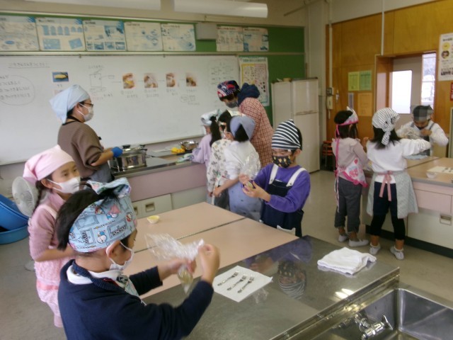 1,2年生が収穫したさつまいもできんとんを作りました。栄養教諭の先生に来ていただ...