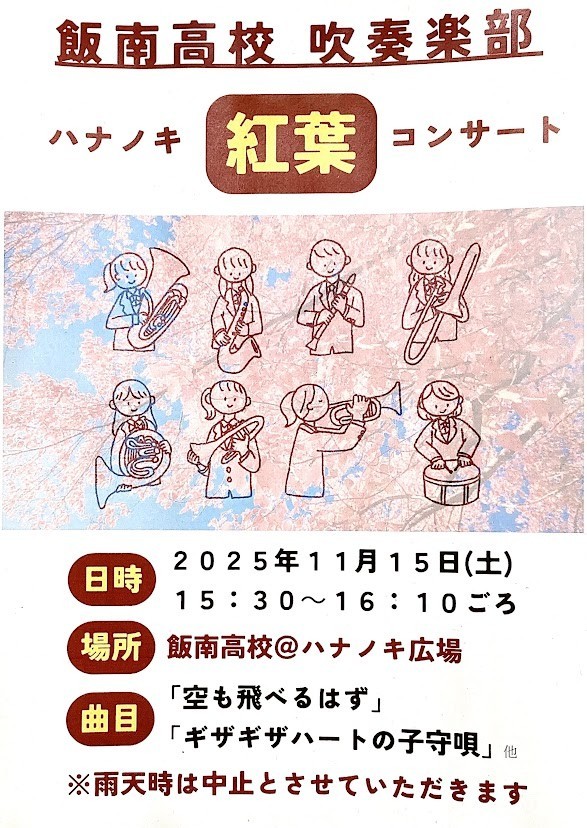 このコンサートは平成28年度(2016年)より始まり、今年で10回目の開催となります。吹奏楽部の定期演奏会として、紅葉したハナノキの下で、日頃練習してきた成果を生徒や地元住民の皆様に披露しています。皆様お誘いあわせの上、音楽と紅葉の宴に是非お越しください。今年は例年とは日時に変更がありますのでご注意ください。