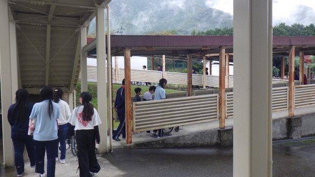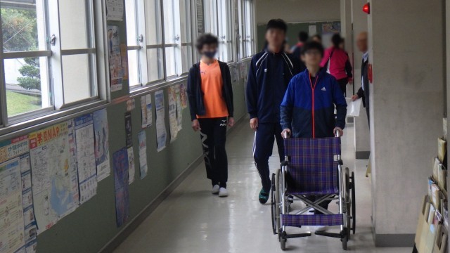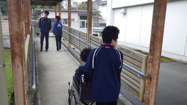 雨だったこともあり、校内を巡ることしかできませんでしたが、みなさんとても上手に車椅子を押すことができていました。