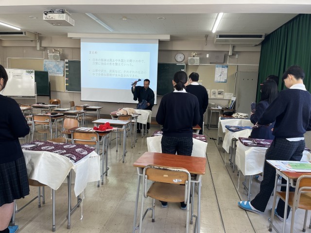 今日は「国際社会と日本」の授業に皇學館大学から新田先生をお招きし、「日本の服飾史を学ぶ」というテーマで授業をしていただきました。