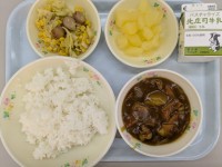 2月2日 学校給食は牛乳 ごはん カレー 三色ソテーフルーツ(りんご) でした。...