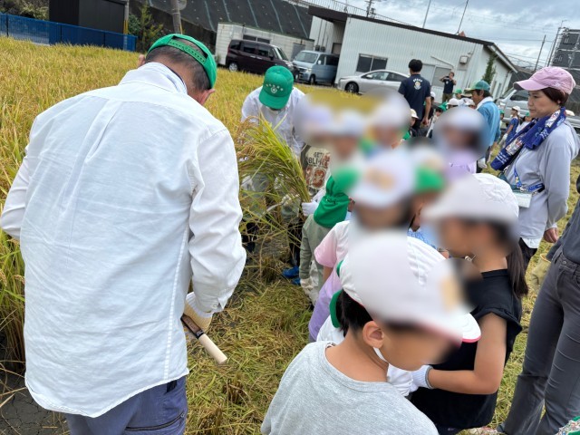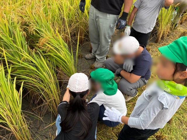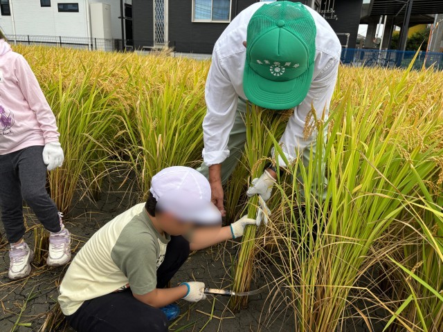 2組の稲刈りの写真です。