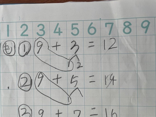 その後、ブロックと同じ操作を計算で行いました。家庭学習でもくり上がりのあるたし算をする際、「まずは10を作ってから、あといくつ?」と考えるように声をかけていただけるとうれしいです。