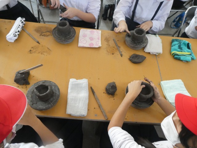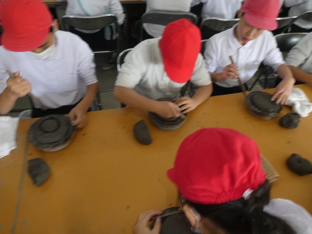 たぬき村の方の指導の下、集中してお皿やコップ、お茶碗などの器作りに取り組んでいました。