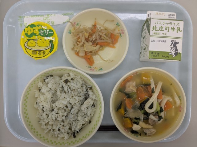 牛乳 わかめ入り麦ごはん 冬至うどん