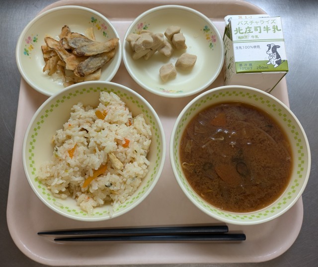 牛乳 大根ごはん つくね汁 高野豆腐の煮もの ごぼうチップでした