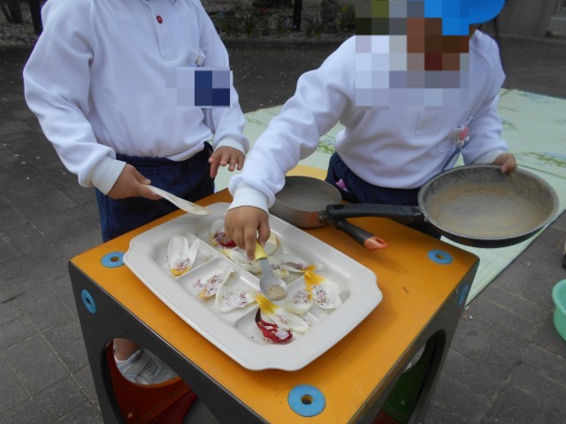 きれいに咲いていたチューリップの花が枯れてしまったのですが、それを遊びに取り入れてお料理作りです。