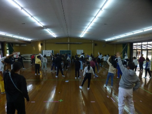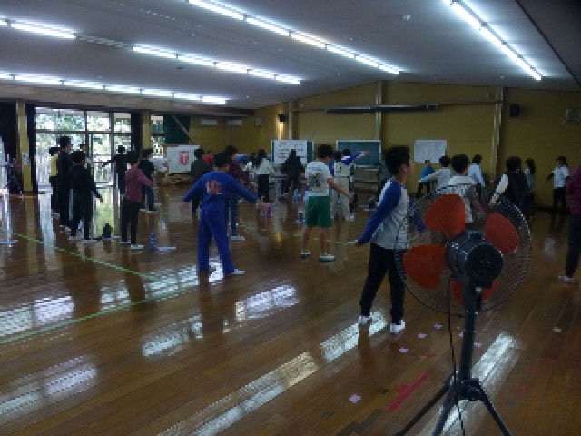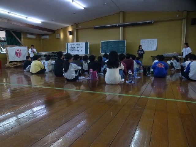 毎日の朝の集いはラジオ体操から始まります。眠たい目をしている子どもたちもいますが、ラジオ体操が終わるころにはすっきりと目が覚め、前日の班長会議で話し合った「今日のめあて」をしっかり聞いていました。また、前日の活動でがんばっていた人の紹介では、みんなで大きな拍手を送りました。
