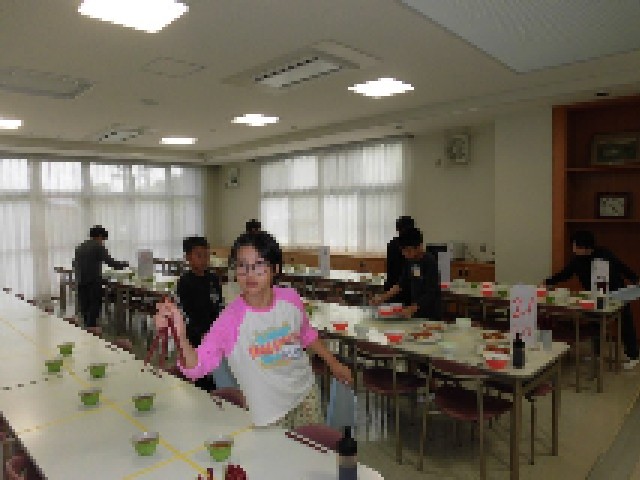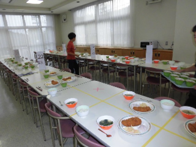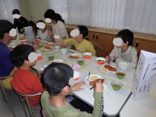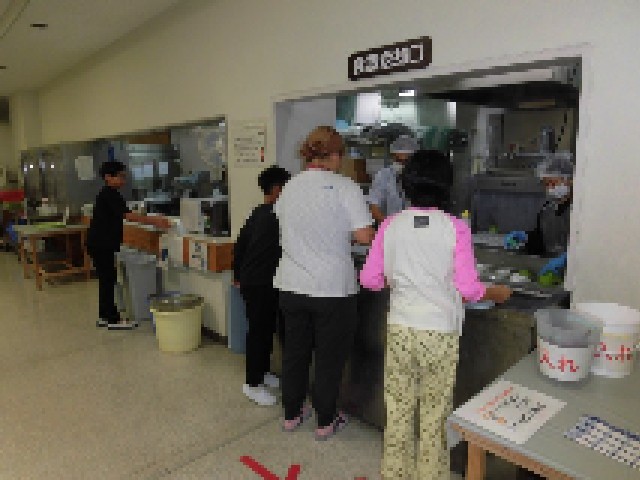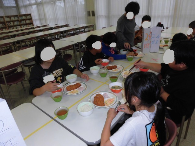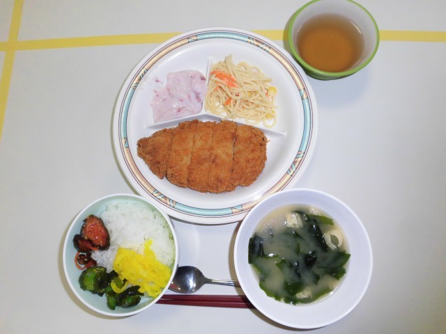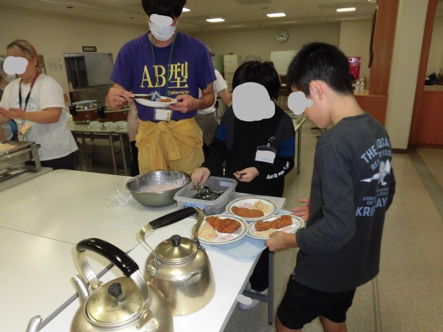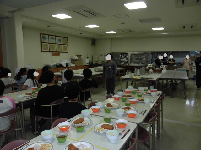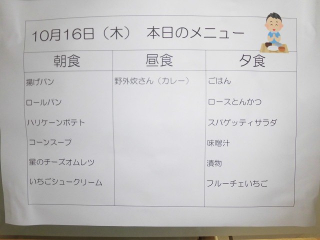 10月16日(木)自然学校3日目の夕食は、ごはん、ロースとんかつ、スパゲッティサラダ、味噌汁、漬物、フルーチェいちご です。食事の準備も手際よくできるようになってきました。今日もたくさん食べました。