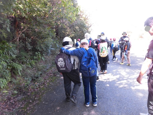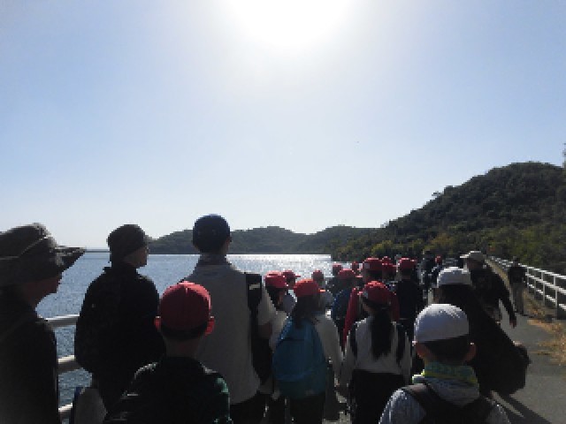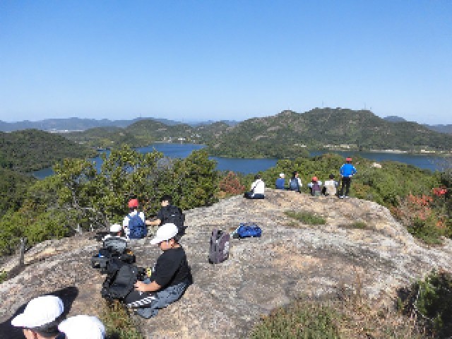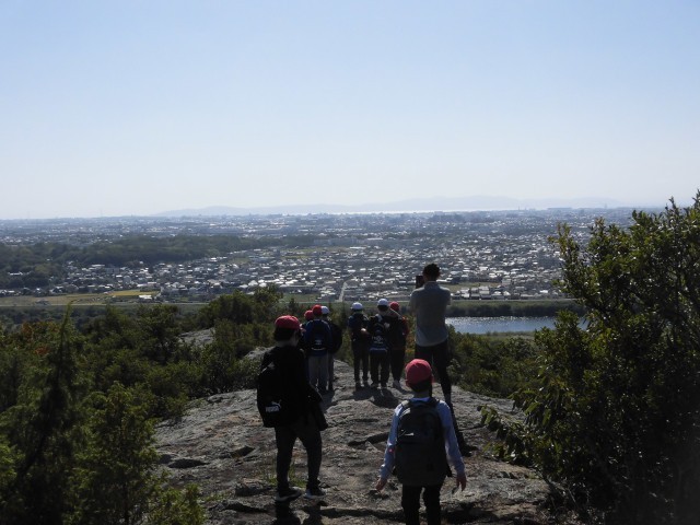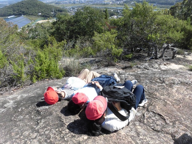 自然の家から、平荘湖の周りにある、古墳を散策しながら、標高105メートルの升田山に登りました。山頂に登るまでは、急な崖を上ったり、下ったりしました。途中でくじけそうになった時は、子どもたちで励まし合いながら、全員で登頂できました。山頂からは、明石海峡大橋や淡路島、家島、小豆島も見ることができました。子どもたちは、山頂に登った達成感いっぱいの顔をしていました。大観小学校の方を向いて、「ヤッホー」と大声で叫んだり、お昼寝をしたりしました。