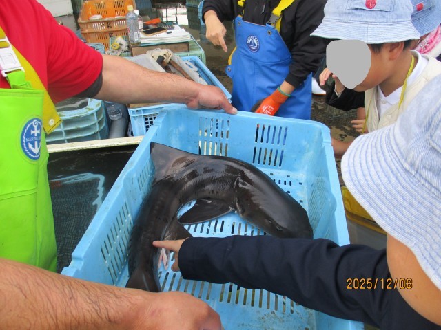 子どもたちは、競り人の威勢の良い掛け声と次々と流れてくる魚に目を奪われ、指で値を表す独特の競りの様子に圧倒されていました。待機していた際に、仲買の方に競り落とした大きな鯛やサメ、鱧を見せて頂き、水揚げされたばかりの活きの良い魚に興奮する様子が見られました。