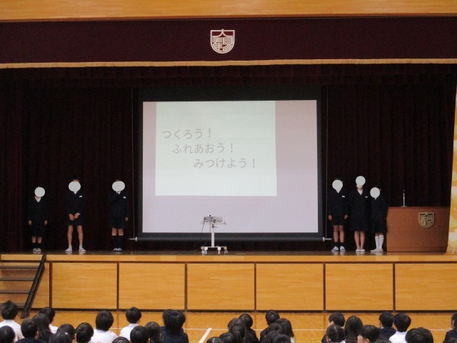 4月30日全校生そろってはじめての朝会をおこないました。校長先生のお話の後、児童会から今年のスローガンが発表されました。今年は、「つくろう!ふれあおう!みつけよう!」です。