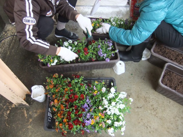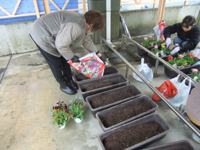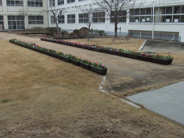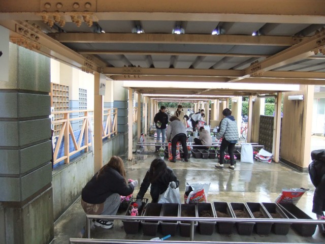 2月25日(木)、雨になりましたが3年PTAでプランターに花の苗植えを行いました。