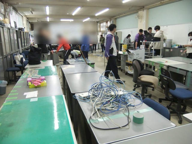 今回の訓練では、通常の避難経路の一部に障害物を設置して行いました。