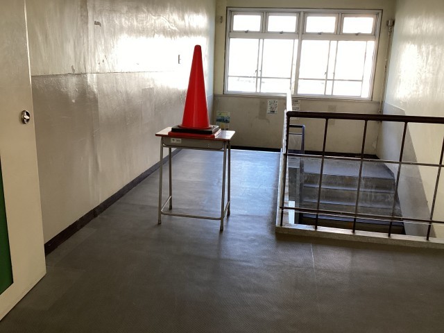 今回の訓練では、通常の避難経路の一部に障害物を設置して行いました。