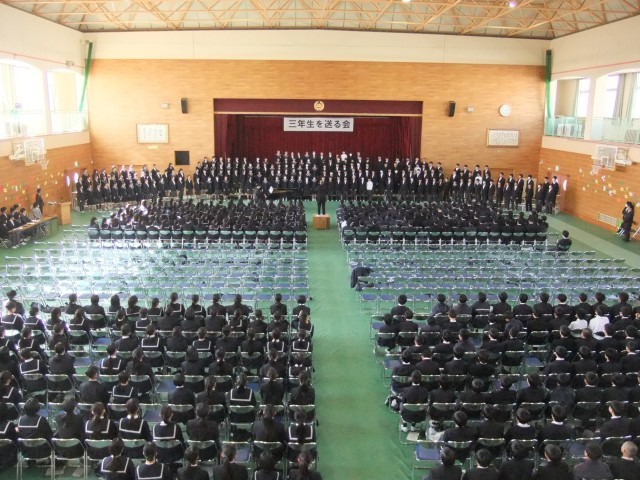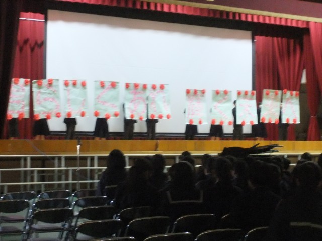 4日(火)、3年生を送る会を行いました。吹奏楽部の演奏で3年生が入場。校長先生の話のあと生徒会執行部より 思い出のムービーの上映がありました。転勤された先生方からのメッセージや行事の写真など3年間を振り返る懐かしい映像に歓声が上がっていました。1.2年生は感謝の気持ちを込めて学年合唱をしました。最後に3年生の学年合唱がありました。さすが3年生という合唱でした。全校生が集うのは最後になりますが生徒会執行部を中心にすばらしい集会となりました。