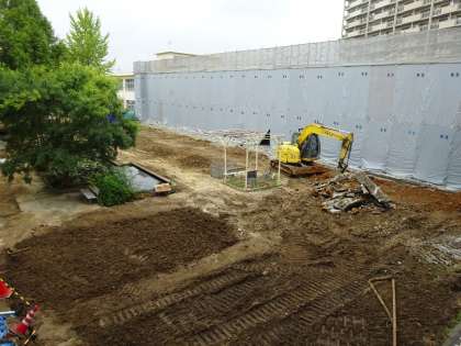 北校舎は足場が組まれシートに覆われています。中庭では少し木が残っていますが今年もセミがにぎやかに鳴いています。