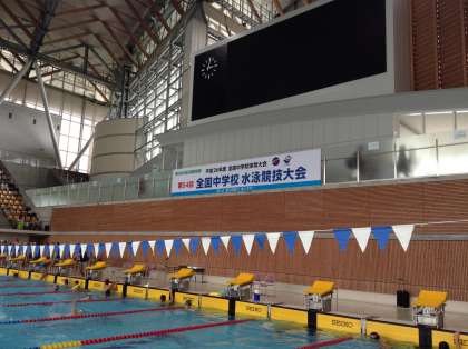 今年度、全国中学校総合体育大会に水泳部から5名、陸上競技部1名と硬式テニスで1名が出場しました。今年も生徒昇降口の上に横断幕を掲げています。