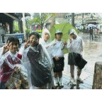 すごい雨にも負けず楽しんでいます。傘の人、かっぱの人どちらがよかったのでしょうか。子供たちなりにぬれない工夫はしているようです。