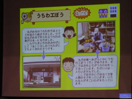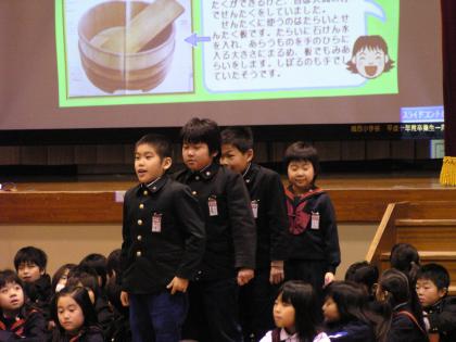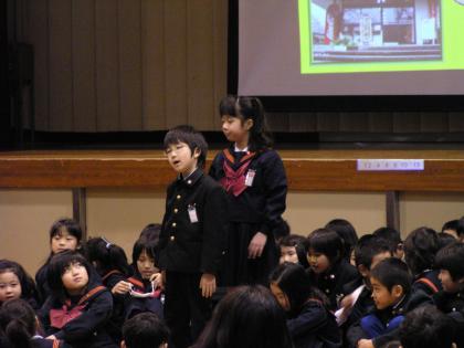 先日,全校生の前で,総合的な学習の時間に探検したり学んだりしたことを発表しました。4月から,「丸亀大発見」というテーマで,小学校の近くを探検してきました。1月の授業参観では,グループごとに劇やクイズ,新聞,ポスターなどいろいろな方法で発表会をしましたが,今回は,パソコンに打ちこみ,プレゼン風に発表しました。わずか10分間の発表時間だったので,わかりやすく簡単にまとめるのが難しかったようです。それに,全校生の前でとても緊張していたようですが,よい体験となりました。他の学年の発表をみることもでき,いい刺激を受けました。