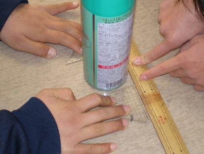 身近な円の形をしたものの円周や直径の長さを測ったり、円の形に切った厚紙を転がして円周の長さを測ったりして、円周と直径の関係を調べました。具体物を用いた算数的活動を通して円周率を理解し、公式へとつなげていきます。