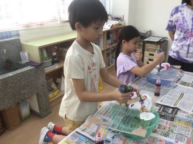 8日(水)Tシャツ染めをしました。桃色と藍色の染料で,楽しみながら染めました。保護者の皆様,準備物のご準備,ありがとうございました。本番,楽しみにしていてください。